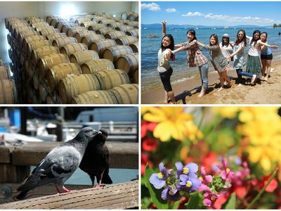 我们参观了隐藏在群山之中的napal valley酒庄,在山顶品红酒,赏远景,颇有情调;行走在古镇Sonoma,百年前的石材房屋仿佛把人带回了从前集市的热闹氛围;让我们印象最深刻的当属lake Tahoe之行,坐落高山,水域开阔的太浩湖清澈湛蓝,加州金色阳光铺洒在沙滩上,大伙儿光着脚,或与野鸟戏水,或驾舟逐浪,完全融入了大自然;在旧金山这个繁华大都市,我们把身影留在了渔人码头pier 39、联合广场union square、金门大桥golden gate bridge。