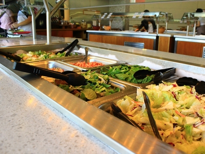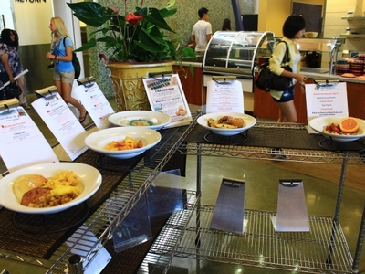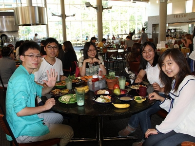 与伯克利餐厅相同,自助式的食堂提供风格各异、种类丰富的食物。大伙儿可以根据自己喜好,选择美式、意式、墨西哥式等主食,同时享受加州阳光沐浴的各种水果,饭后还有浓郁的甜点……在这里,我们尝到了各国风味,了解了美国人的饮食习惯,认识了许多不曾接触过的baker、沙拉、cream。
