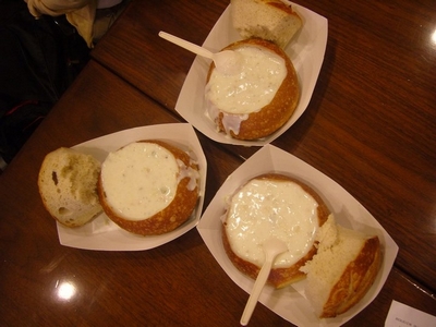 2、在旧金山的蟹粥面包,面包超级酸,在这个貌似盖子的东西下面,是热腾腾的浓汤,里面是新鲜的蟹肉。尝一口,真是舒服极了。