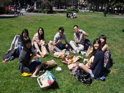 7、集体出发玩一般在食堂打包午餐,暖暖的阳光、舒服的草地、围坐而享受,外出的午餐时刻总是很欢乐!离宿舍旁边有一家超市Trader Joes是自制自销的,便宜又独特又好吃,里边还有卖泡面,和康师傅味道差不多的泡面竟然被我们找到了,宿舍一楼厨房里有鸡蛋和小锅,so…哈哈…在戴维斯的downtown吃货们各取所需,有台湾小吃、墨西哥餐厅、寿司自助等等,寿司自助每人$15,老板是华人,态度超级好,最后还让打包了三大盒寿司回来给所有人享用!还有一家湖南餐馆,吃多了西餐看到了我们本土美食那是眼前一亮,就在门外看了菜单就流口水了~~(太激动了,没有拍照但肯定是真相!)