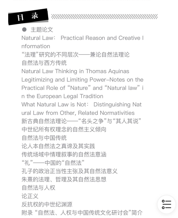 荣誉教授约翰•菲尼斯(John Finnis)参会,菲尼斯教授是当代著名法学家、自然法学派的代表人物,在法哲学领域享有盛誉,此次也是菲尼斯教授首次访问中国。通过此次会议的同台论道,国内外学者探讨了西方自然法与中国传统文化的差异与共通之处,深入挖掘了我国传统文化所蕴含的自然法和人权保障思想,对于自然法理论和中国传统文化都有了更深刻的感悟、更多元的认知。本书按照本次会议的主题及收录论文的情况分为主题论文、自然法与西方传统、自然法与中国传统、自然法与人权四个部分,力图反映本次会议旨在通过中西自然法与人权的对话建立共识的宗旨,为了保留国际对话的面貌,本文集采用中英双语形式,即保留论文的原文。各位论文作者的佳作异彩纷呈,也由每位读者通过各自的解读去参与这些作品的形成——作品永远也不会完成,而自然法的话题更不会穷尽,但在自然法与人权的作品写作与解读过程中,中外学者倒是可以形成视界交融,建立共识,比如朱熹—阿奎那共识,从而让我们人类命运共同体多一分沟通,多一点理解。