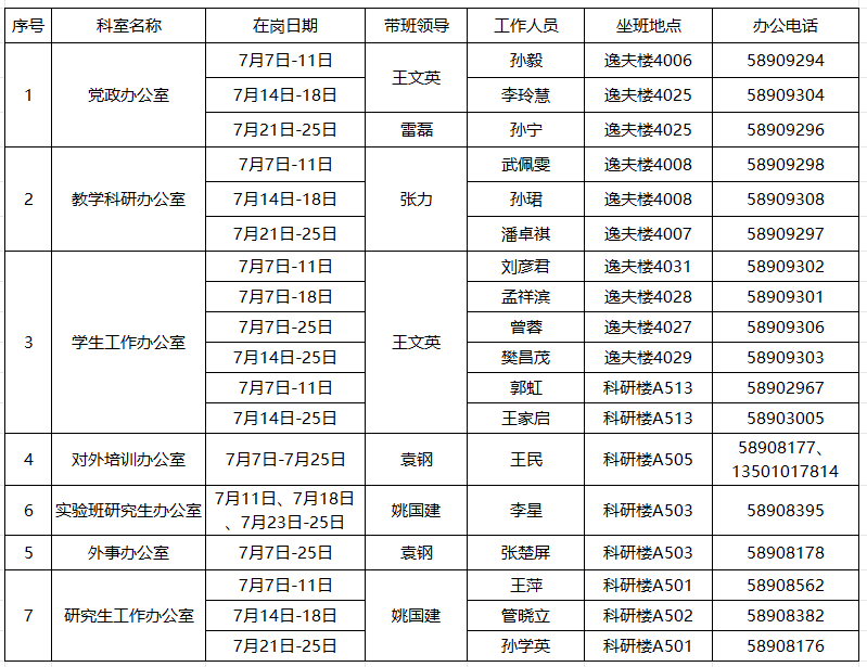 1. 6月30日-7月4日(第一周),学院行政系统全员在岗。