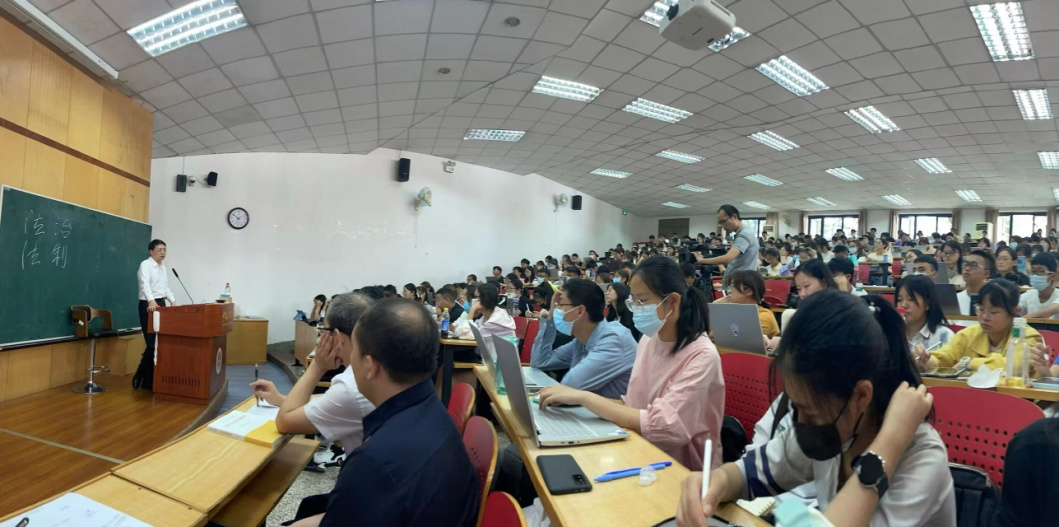 马怀德校长希望同学们能够打牢法律根基,树立法律思维,注重理论与实践相结合,努力成为德法兼修、明法笃行的高素质复合型法治人才。2021级新生近400名同学认真听讲,积极思考,气氛活跃,逐渐领悟习近平法治思想的丰富内涵和深刻论述,课程在经久不息的热烈掌声中圆满结束。