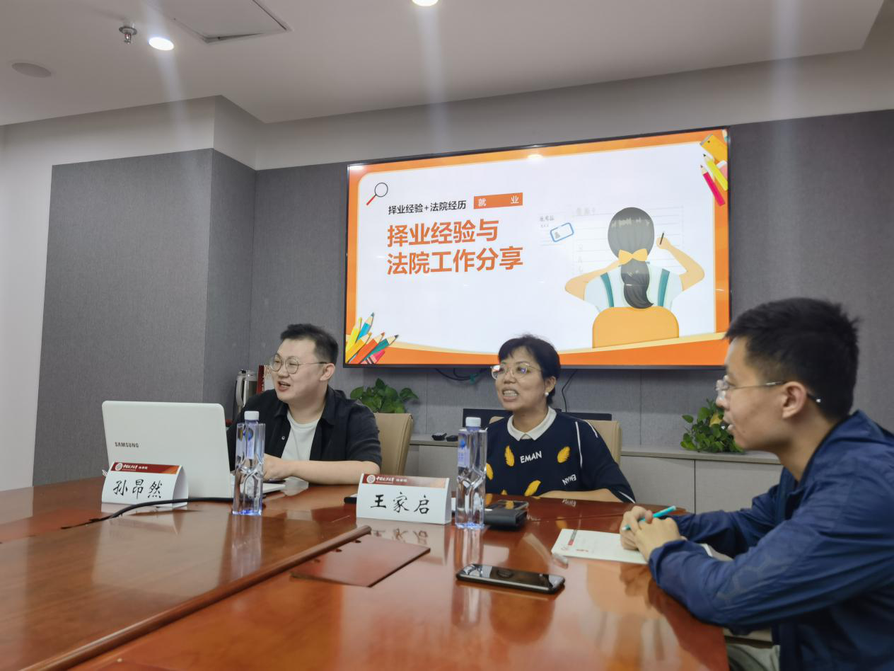 本次分享交流会分为两个环节。第一环节为经验介绍。孙昂然结合自己在央企、国企、公考中的成功经验,向大家介绍了不同工作岗位所需的人员特质、考核方式及备考技巧。之后,又向大家分享了其在北京市第四中级人民法院任职中的趣事和挑战。他强调,在求职过程中,要善于挖掘自身“夺金点”,充分发挥个人优势,以求匹配到最适合自己的岗位。