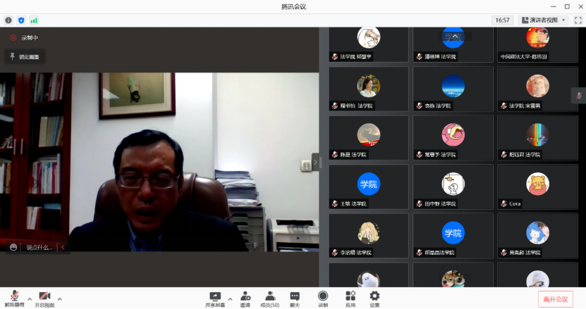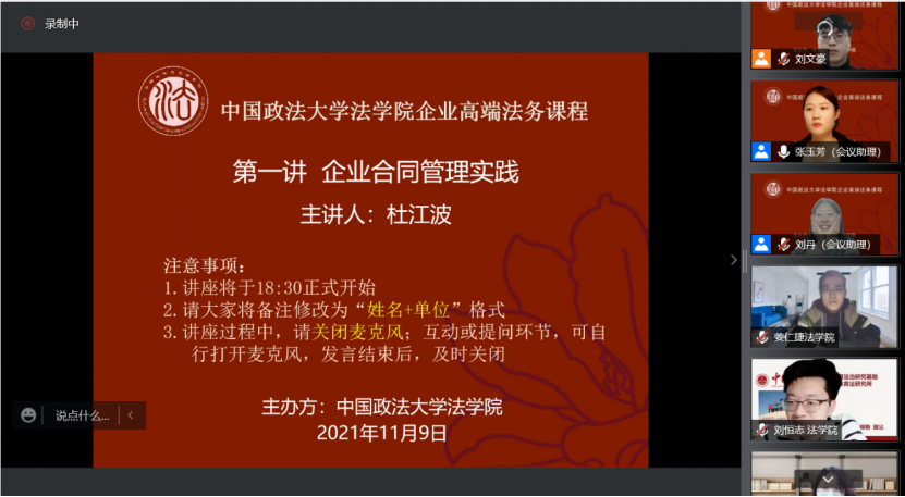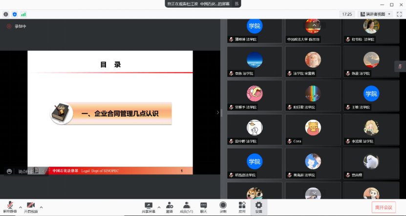 实务讲堂之企业高端法务课程第一讲“企业合同管理实践”在腾讯会议上举办,由中国石化集团公司企改和法律部负责人杜江波主讲。