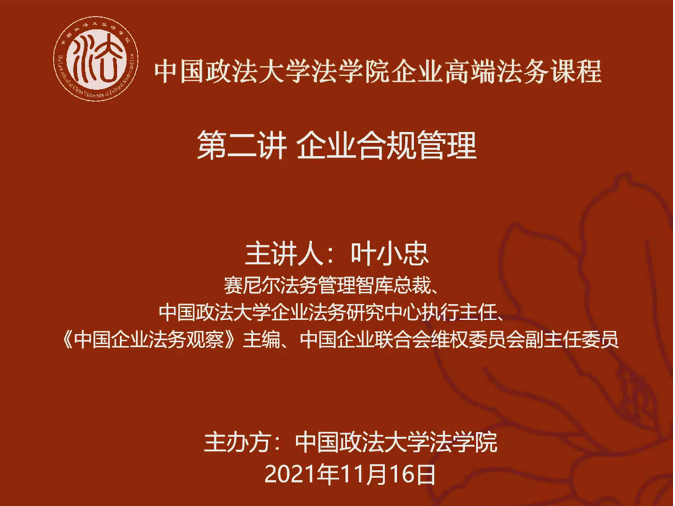实务专家讲堂之企业法务高端课程第二课“企业合规管理”以腾讯会议的形式在我校线上举办。本次课程由赛尼尔法务管理智库总裁、黑料网