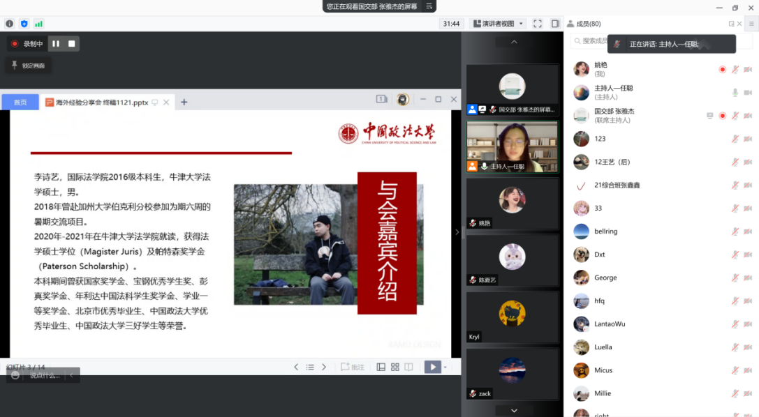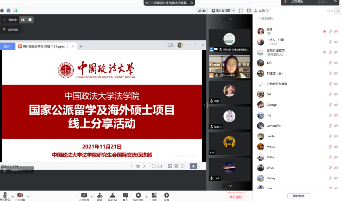 研究生会承办的国家公派留学及海外硕士项目分享活动在线上举行。2020级博士研究生王晓淑,2019级博士研究生陈子君,2020级硕士研究生刘子婧,2016级本科生、牛津大学法学硕士李诗艺受邀担任主讲嘉宾。