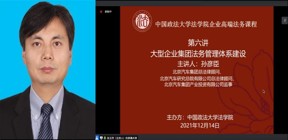 实务专家讲堂之企业法务高端课程第六讲“大型企业集团法务管理体系建设”在腾讯会议上举办。本次课程由北京汽车集团总法律顾问、北京汽车研究总院有限公司总法律顾问、北京汽车集团产业投资有限公司监事孙彦臣主讲。