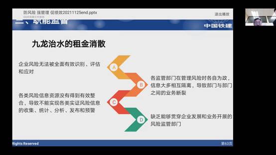王甲国先生首先讲解了有关风险的内容,他表示,风险充满了不确定性,每个企业对于不同程度的风险都有自己的应对措施。在讲到如何防控时,他说把握好管什么、风险的原因是什么、处置是什么,具有重要意义,要做到全员抓、全面抓、全方位抓。对于特定工作、特定领域、特定级别的风险,要重点防控,并落实好三道防线的最新风险管理要求。最后,在讲解职能监督时,王甲国先生从“监管之子”理论入手,结合监管型政府崛起的实践特征,详细阐述了法律合规部门对于公司各部门在各阶段的主要工作。他还表示,“九龙治水”使企业风险无法被全面有效识别、评估和应对,而内部法律顾问和律师之间存在着工作内容上的不同,因此在监管崛起背景下的法律合规制度是企业的最优选择。“大合规”就是要建良规、立体合、强执行、突出重点。