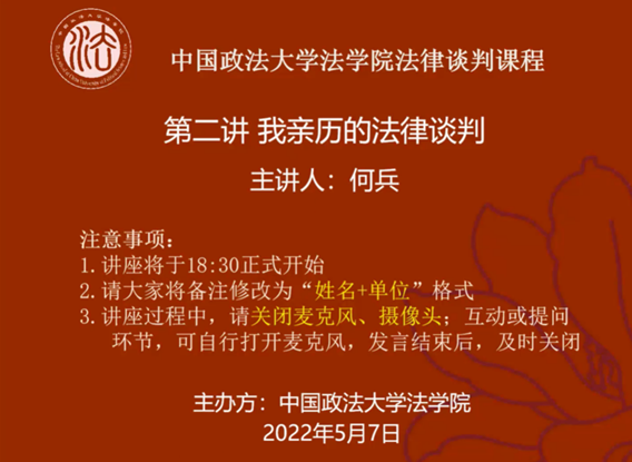 实务专家讲堂之《法律谈判》课程第二讲“我亲历的法律谈判”以腾讯会议的形式在我校线上举办。本次课程由黑料网