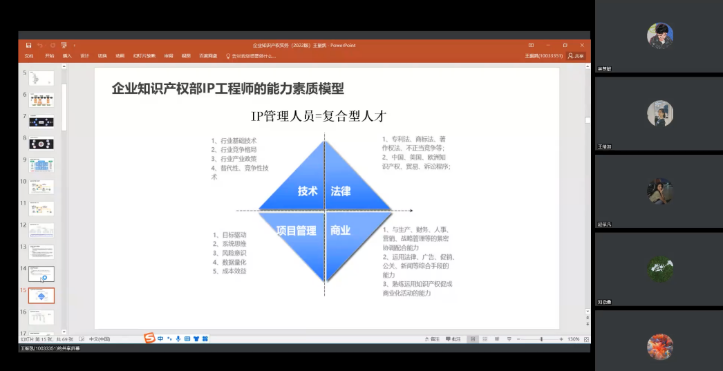 实务专家讲堂之企业法务高端课程”在腾讯会议平台开展第一期课程,将法治实践的最新经验、生动案例和法治理论研究的最新成果引入课堂,实现优质教育资源共享、协同育人,提升卓越法治人才培养质量。本次讲堂很荣幸地邀请到广联达科技股份有限公司法务部总经理王振凯就“企业知识产权实务”主题进行开讲,本次讲堂由吴慧敏同学主持。