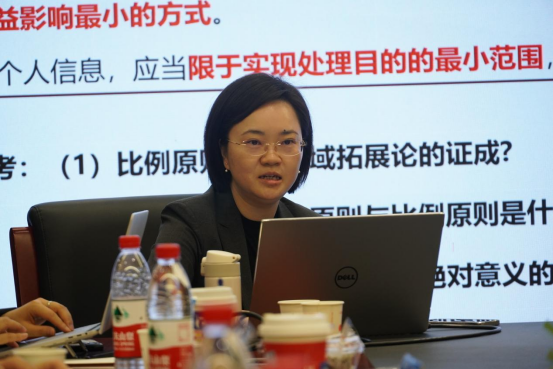 论坛首先由蒋红珍教授主讲发言。蒋红珍教授从《个人信息保护法》第5条、第6条引入大家思考三个问题,即比例原则适用领域拓展论如何证成、最小必要原则与比例原则是什么关系、所有的信息处理行为是否都要遵循绝对意义的最小侵害标准。随后,蒋红珍教授从三个案例中总结了比例原则的全阶式适用、截取式适用、概括式适用三种适用模式,并从内部视角和外部视角两个角度对位阶秩序选择的规范机理进行阐释,最终回到对前述三个问题的解答。