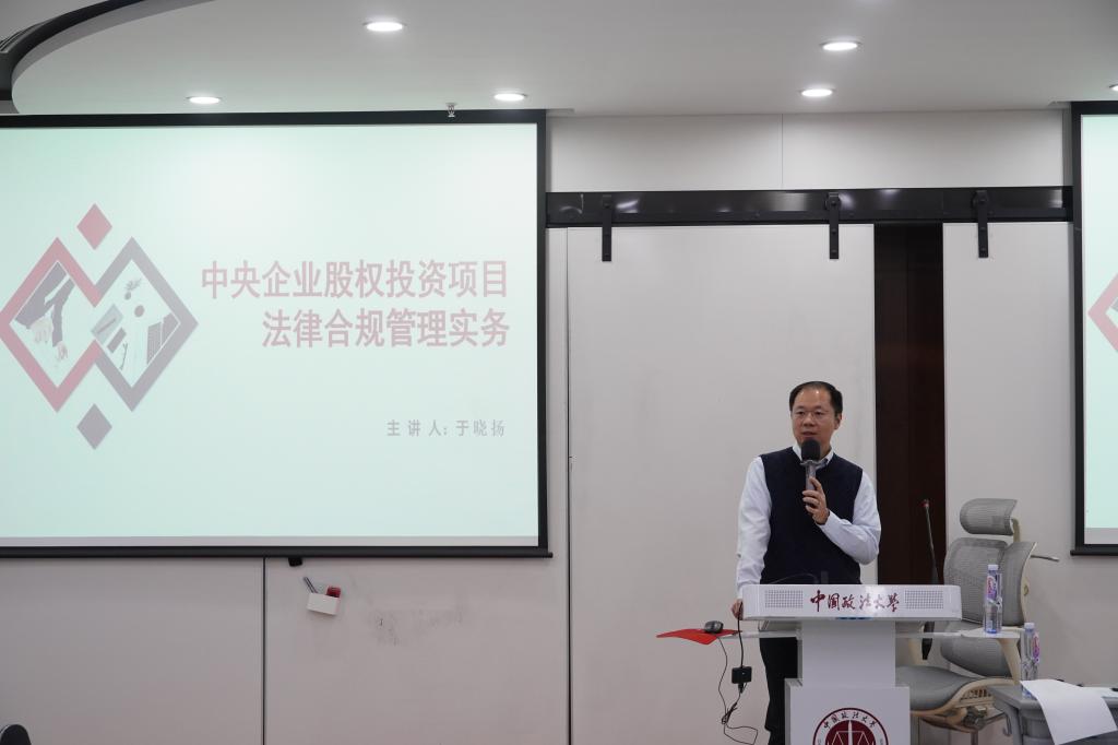 实务专家讲堂之企业法务高端课程第六讲之“中央企业投资项目法律合规管理实务”在我校学院路校区举办。本次课程由国家开发投资集团有限公司法律合规与风险管理部副主任于晓扬主讲,由丁凌枫同学主持。