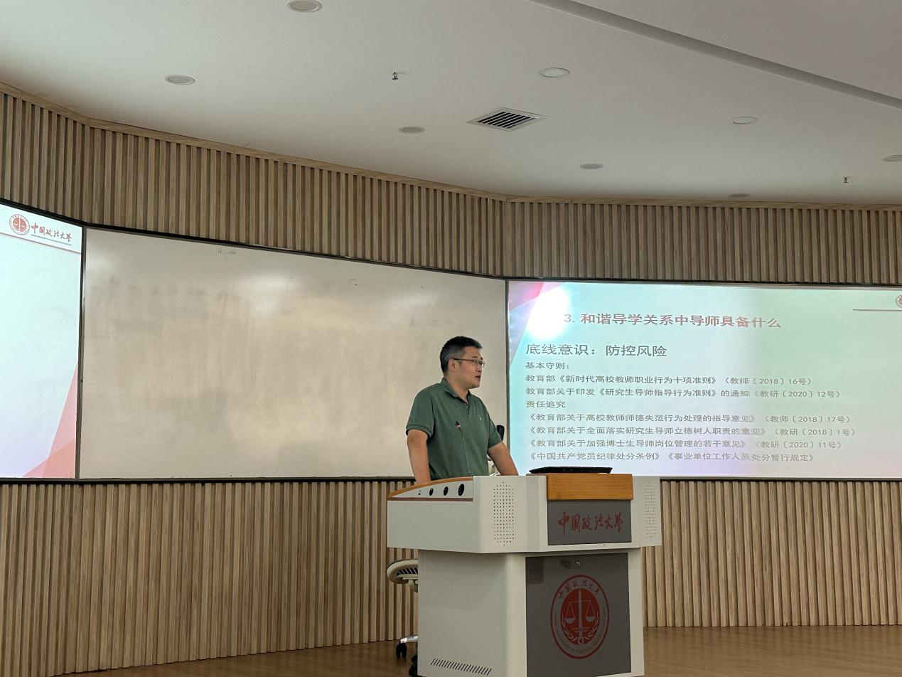 院长雷磊教授最后总结讲话。他指出,导师应当以人才培养为第一要务。导师在做好个人学术研究与教学活动的同时,要对学生给予更多的关心。其次,他认为导师应当坚持育人者先自育,不仅在专业方面进行自我教育,而且要时刻牢记立德树人根本任务,紧紧围绕学校与学院的整体工作安排展开自身活动。再次,他强调导师应当坚持做“经师”和做“人师”的结合,一方面坚持做“经师”,培养学生的学术能力,另一方面要做“人师”,做好学生的引路人。最后,他号召导师应当充分意识到研究生培养的重要性,共同为研究生人才培养贡献自己的力量。