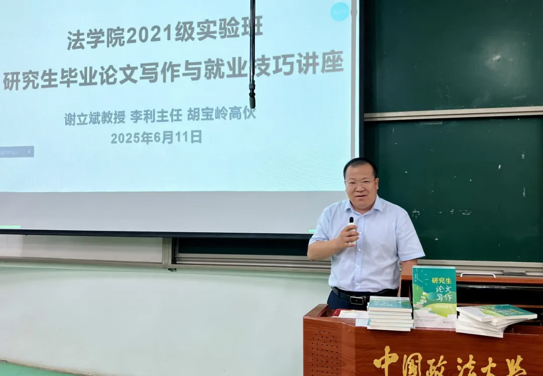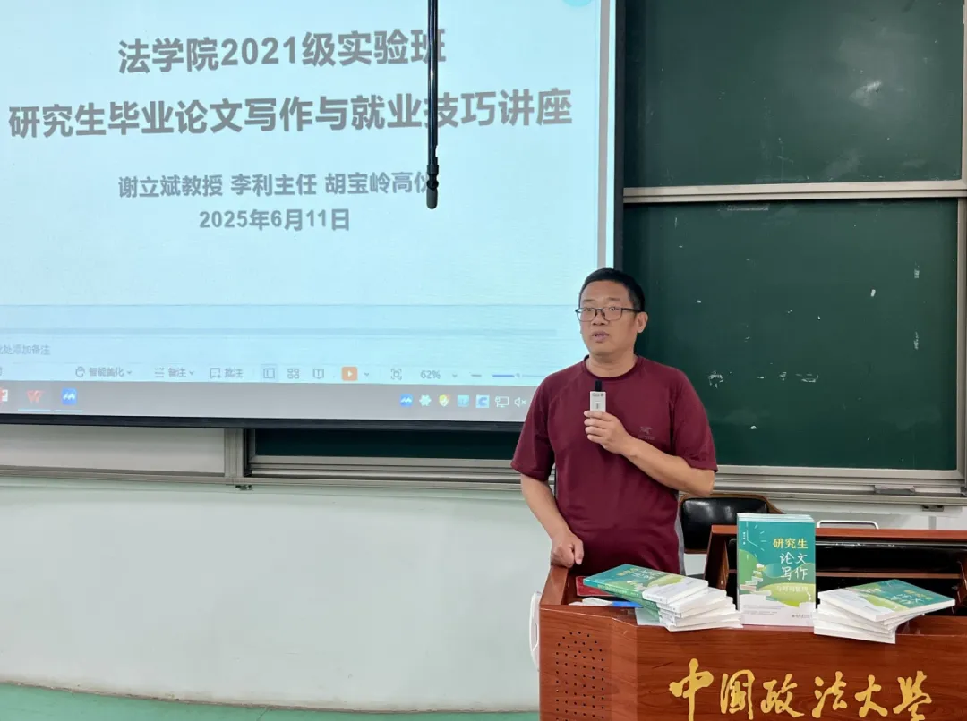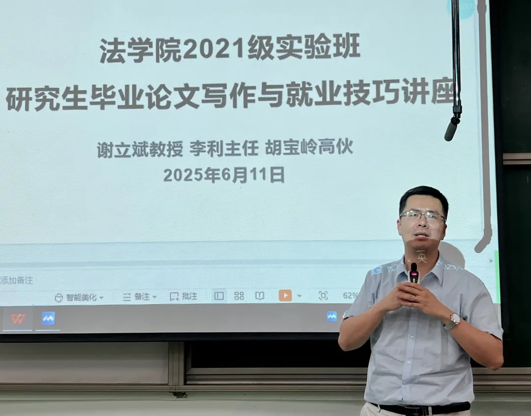 院长谢立斌教授,以“法学论文写作与时间管理”为题展开分享。他系统讲解了毕业论文的选题策略、文献阅读方法、构思逻辑、初稿撰写要点及修改技巧等内容,并重点剖析了同学们存在的常见写作误区。同时,他结合自身及其他名人的经验、经历,诙谐生动地传授了时间保障、状态管理、日程制定等时间管理方法,助力同学们克服拖延、提升效率。