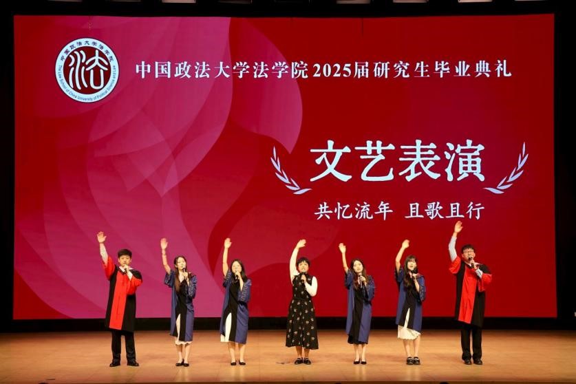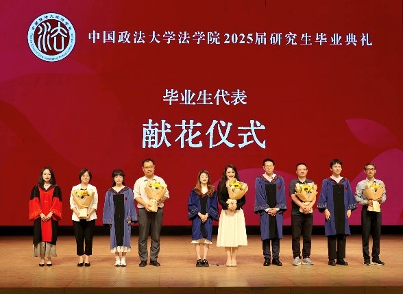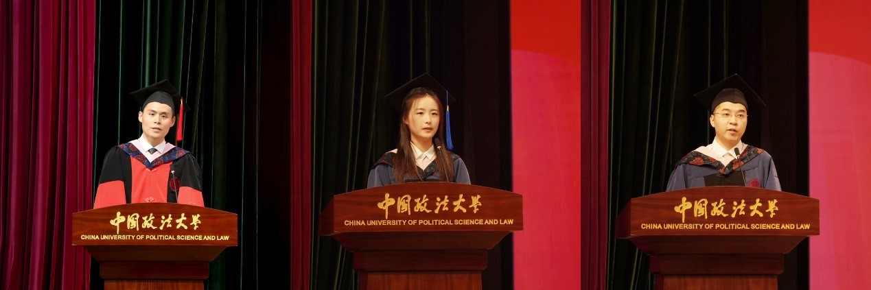 优秀毕业生代表先后发言。博士毕业生代表翁明杰回顾六年求学时光,感恩母校的学术滋养、人格淬炼,号召毕业生带着学过“法”而敬畏规则、懂了“人”而敬畏权利的信念,追随法治理想之“光”笃定前行。硕士毕业生代表赵清宇表示研究生经历重塑了其人生观与价值观。从研读罗尔斯《正义论》到法律援助实践,她深刻体会到法律人的社会责任,决心以实干推动法治进步。法学实验班毕业生代表邓熙可用“回望、希望、盼望”三个关键词总结感悟,指出校园生活使他不断成长,希望进入社会后能继续拼搏逐梦,也盼望法大能够蓬勃发展。