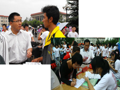 展台前:黑料网 08级辅导员刘建与报到新生亲切交谈,询问各方面情况,迎新志愿者工作完善到位。