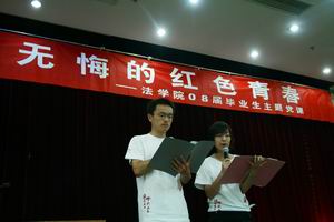 接下来,2008届各班党支部合力奉献了回顾四年组织生活的系列节目。首先是“向往党旗”,在场的学生党员重温入党誓词,缅怀大一入党激情。然后,大家观看了主题为“走在党旗下”的党支部活动纪录片,又以深情的合唱表达“在党旗下成长”的繁荣历程。最后,两名党员以诗歌朗诵形式,抒发坚定共产主义理想与中国特色社会主义信念的决心,并颂扬抗震救灾中党组织的政治核心作用、战斗堡垒作用及广大共产党员的先锋模范作用。至此,本次主题党课在庄严的国际歌中圆满结束。
