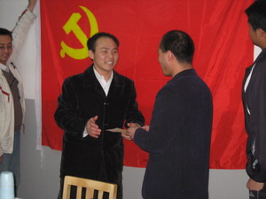 接下来,该支部举行了“党组织送温暖活动”仪式。该支部成员张小兵同志日前误入天津某传销组织,虽然凭借良好的心理素质和强健的体魄,与该传销组织成员斗智斗勇,被其控制4天后,成功脱离并返回学校,但是依旧损失1000余元。张小兵同志出生于贵州边区,家庭经济十分困难,这突如其来的损失无疑是雪上加霜,鉴于此,党支部决定为其募捐,用实际行动帮助身边的困难党员,以体现党组织的关怀,更是坚持“以人为本”核心学习实践科学发展观的必然要求。张小兵同志在班上担任班长,认真负责,任劳任怨,深得大家的认可,一经号召,全体党员同志纷纷解囊,短短几分钟募得400元。当张小兵同志从党支部书记张青超手中接过代表组织关怀的“心意”时,他激动地说“十分感谢党组织以及全体同志的关心,我定会和大家一起在学习、工作各方面更好的发挥先锋模范作用,争取为班级建设作出更多的贡献”。