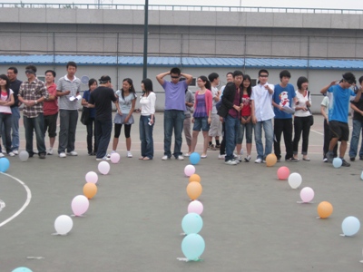 大四趣味运动会开始。趣味运动会分五个项目进行:“我指点,你踩球”、“投靶掷准”、“十人毽球”、“靠得近”足球和“背靠背”接力赛。按照抽签分组的方法,把九个班级分为A、B、C三组进行趣味比赛。