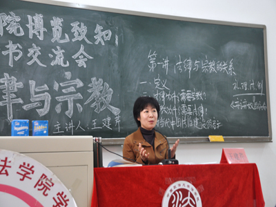 交流会开始,王教授首先从自己的经历谈起,和同学们分享了她与宗教接触的过程,讲述了自己如何由南怀瑾先生的《孟子旁通》、《老子他说》、《论语别裁》中认识到宗教的真正含义。然后,她从法律与宗教的发展史中得出了法律不能离开宗教,宗教也同样不能离开法律的观点,并从以下四方面阐述了她的观点:第一,伯尔曼对法律与宗教的理解即法律与宗教是相辅相成的关系;第二,从《亦主亦奴的社会》及《罗马盛衰原因论》两本书中得出了宗教对法律发展的巨大作用;第三,从宗教对法律的巨大作用阐述了法律与宗教的相辅相成的关系;第四,从伯尔曼《法律与宗教》一书中对宗教与法律的关系阐述,提炼出对中国法治建设有益的启示。