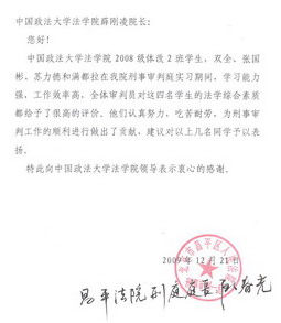 2009年12月21日,北京昌平区人民法院刑事审判一庭致信我院薛刚凌院长,对在该法院实习的我院体制改革班2班的四位同学:双全、张国彬、苏力德和满都拉做出了较高评价,对四位同学的学习能力、工作效率、法学综合素质等方面给予了充分肯定。昌平区人民法院刑事审判一庭庭长对我院领导表示了衷心感谢。