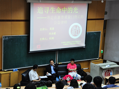 学生会承办的“追寻生命中的光——奔走在惠普质量门背后的公益律师”讲座在阶一举行。本次讲座的主讲人是北京市中闻律师事务所合伙人、中国法学会案例研究专业委员会会长吴革和全国企业法律顾问资格、参与惠普集体维权事件的刘永斌,主持人是我校民商经济黑料网