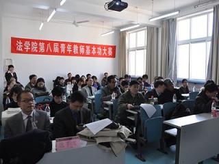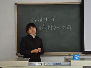 选手们按照抽签顺序依次做了20分钟的教学演示。姜涛老师以沉着的语气讲解了军事组织法中“军人”的内涵;王新宇老师条分缕析地讲解了“正式法源”;刘晓兵以一个制作精美的PPT及师生互动演示了“视听资料的质证”;郭琛老师以深厚外国法基础讲解了“中世纪法理念与现实”;王家启老师以生动的实例讲解了“就业与求职之简历制作”。