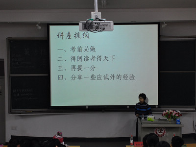 学生会承办的四六级模拟考考前指导在昌平校区阶七举行。本次讲座请到的嘉宾是来自新东方的侯文竹老师。