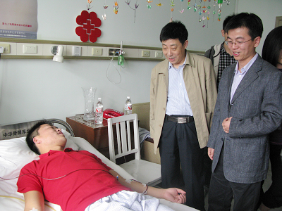 分党委书记兼副院长刘大炜,团委副书记孙璐一行来到空军总医院探望自愿无偿捐献造血干细胞的志愿者张骥,并转达了校党委副书记兼副校长冯世勇的问候。