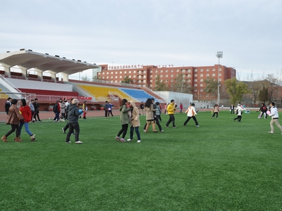 在两位主持人以幽默诙谐的方式做了开场介绍并宣布趣味运动会开始之后,学生会的九个部门被分为A、B、C三个组分别进行比赛。在组织者的带领下,大家以极高的热情开始了这次活动。第一项比赛“盲人射门”,由两人搭配进行蒙眼射球,在欢笑与喝彩之中,各部门默契感急速上升,为活动的进一步开展铺陈了欢乐和谐的氛围。接下来进行的“八人毽球”和“向我开炮”两项比赛,各部门在激烈的竞争中都表现出色,笑声不止,趣味无穷。比赛项目“气球快跑”可谓是此次运动会的重头戏,每个部门派出了4对选手参加,每对选手面对面夹着气球在足球场上完成一个来回的走动,在这个极其需要参赛者之间默契的运动中,学生就业与发展中心和外联部表现得十分突出。最后“八人九足”比赛中,大家的情绪达到最高点,点燃了青春里最热情洋溢的年华。
