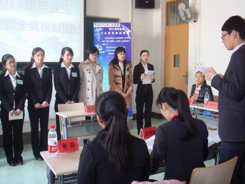 2013届毕业研究生 “巅峰职场”系列活动第五场——全真模拟面试于3月29日在学院路校区举行。活动邀请中公教育的3位公务员面试培训专家出席模拟面试并担任考官和点评人。