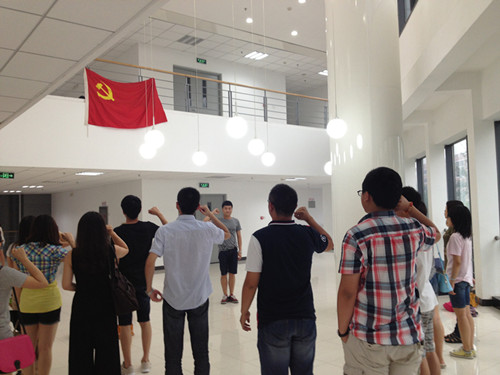 最后,由支部书记领誓,所有新老党员重温入党誓词。当大家都面向党旗举起右拳的一刻,仿佛有一个声音在提醒着每个人:“党员的组织关系是会随着毕业改变的,但誓言和信仰是永远不变的,作为一名光荣的共产党员,要不忘初心,永怀理想!”