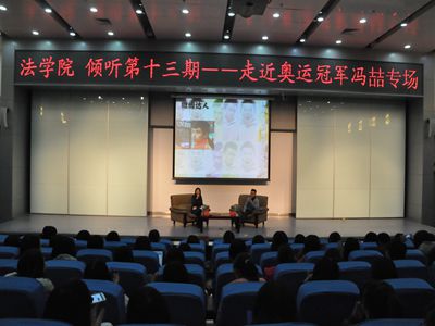在互动环节中,同学们积极踊跃地发言提问,冯喆不失风趣地一一回应。问题涉及与健康饮食、合理锻炼有关的体操知识,同时也有“比赛公平”、“扶起摔倒老人”等社会问题。冯喆激励同学们,作为新时代的法科学生,要为完善中国法律作出贡献。全场气氛轻松活跃。