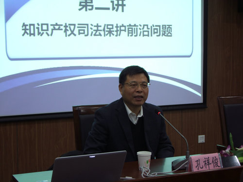 孔祥俊的主讲内容分为其在司法审判中对知识产权的亲身体会、司法政策在知识产权保护中的作用以及对我国知识产权保护的展望三个部分。孔祥俊指出,相比较而言,我国是全球知识产权案子最多的国家。近年来,我国关于知识产权方面的诉讼案件不断增加,体现在司法保护问题上,他认为先有了案件数量的增加后,司法保护质量提高的可能性也会随之增大。他通过引入大量案件加深同学们对知识产权案件司法保护的理解,并总结到如今传统著作权案件相比较而言呈减少趋势,而诸如软件、数据库等商业类著作权案件越来越多。