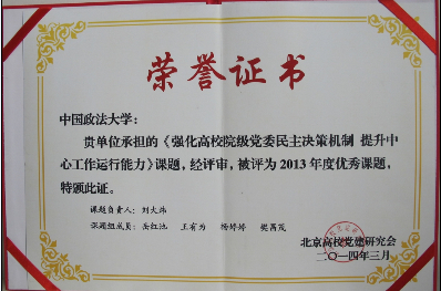 刘大炜主持,岳红池、王有为等老师参加的《强化高校院级党委民主决策机制提升推进学院中心工作运行能力研究》课题,被评为北京市高校党建研究会2013年度优秀研究课题。