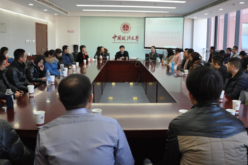 随后2012级体改班的同学们分别就自己的学习生活和实习经历中的感想进行了交流,每个人都不约而同地表示,他们为自己是一名法大人而骄傲,并希望在今后能尽自己的绵薄之力为法制事业做出应有的贡献。
