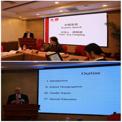 主题发言由薛刚凌教授主持,Charles Russo教授发表题为《美国视角下基于种族、性别和残疾的高等教育的可及性与教育机会平等》的报告,指出未来几年美国法院将继续以多种方式影响教育领域的发展。