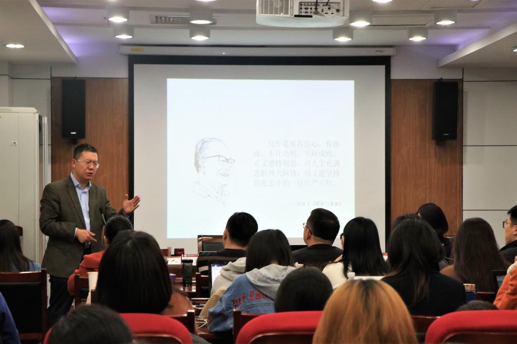 于文轩教授的讲座以生动幽默地介绍自己撰写博士学位论文时的心路历程开始。随后,他从论文写作方法和写作规范两方面出发,与同学们分享自己的经验与心得。一方面,他建议大家选择自己感兴趣的领域作为自己的选题方向,注重论文的逻辑和结构,运用适当的研究方法,注重学术文献的积累和规范运用。另一方面,他强调,撰写博士学位论文应特别注意遵守学术规范,同时要符合学术论文在语言等方面的要求。