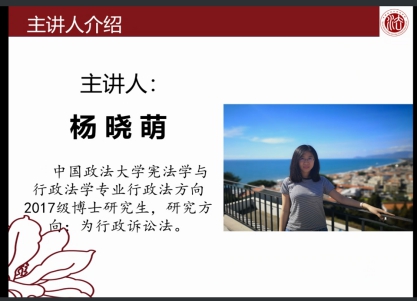 在论文汇报环节,杨晓萌博士介绍自己本次汇报的论文主题为《我国行政诉讼中诉的利益理论的适用》。杨博士的本次论文汇报分六部分展开。