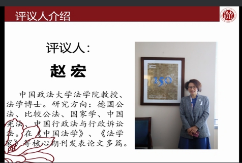 的赵宏教授对文章进行评议。赵宏老师首先肯定了这篇文章的主题,进而就文章如何深化提出了三点建议:首先,文章的序言部分,应当对使用“诉的利益”理论的基本背景做一个大致交待;此外,文章的撰写应当置于行政诉讼的背景下,就“诉的利益”进行阐释;最后,完善论文过程中还需要注重学术写作规范,以增强论文可信度。
