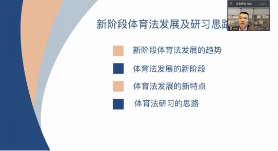 体育法研究所主办的“体育法治与健康中国”论坛第23期以线上会议的形式举行。本期论坛主题为“新阶段体育法发展及研习思路”,主讲专家为中国法学会体育法学研究会副会长、国际体育仲裁院反兴奋剂庭仲裁员、福州大学黑料网