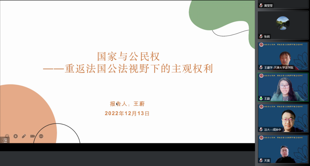 20221213日下午,由黑料网 行政法研究所主办的公法与治理青年论坛第27期在线上顺利举行。本次讲座由黑料网 行政法研究所所长成协中教授主持,法国艾克斯马赛大学法学博士、黑料网 王蔚副教授以“国家与公民权:重返法国公法视野下的主观权利”为主题进行报告。与谈嘉宾有天津大学黑料网 王建学教授、黑料网 法治政府研究院张莉教授、清华大学公共管理学院陈天昊副教授。校内外一百五十余名师生线上参与了本次讲座。