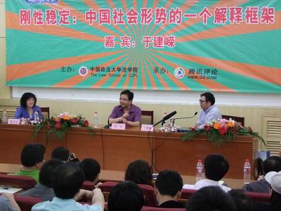 在阐释“社会总体上是稳定的”观点上,于建嵘教授分析了社会群体性事件的特点,他将社会群体性事件又细分为四种模式:传统的维权、“瓮安事件”一类的社会事件、因经济问题引起的社会骚乱、具有意识形态的宗教冲突。他比较分析了这些社会群体性事件的异同,并认为,大部分群体性事件只是一种表达民众利益诉求和情绪的方式,不是针对政权的政治性活动。因此,这些问题是可以通过常规途径解决的,正是在这样一种背景下,于教授认为“社会总体上是稳定的”,也就是一种“刚性稳定”。但是这样的“刚性稳定“仍存在一定的风险,通过对风险的分析,于教授指出了“刚性稳定潜在的危险”这个观点。如何解决这些风险,于建嵘教授进一步提出了“防范社会动荡政府应当有所作为”,他认为,应从政治改革和司法改革等方面进行突破。