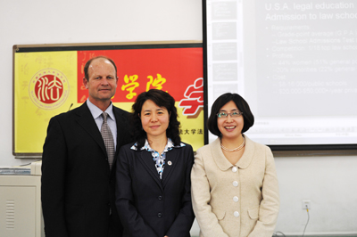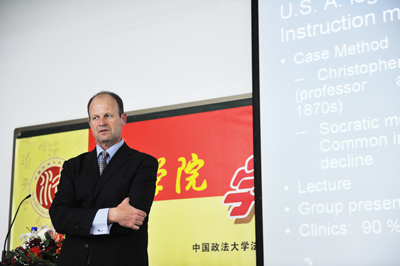 巴恩斯教授主要介绍了美国法学教育的简要情况、课程设置和实践,并分享了他的同事对于法学教育的观点和感受。在比较中美法学教育的不同时,他首先指出,中美法系的不同造成了中美法学传统与教育的不同。他又以一幅表现中国家庭结构的照片为例,从中美两国人口差异入手,指出中国人多律师少,而美国人少律师却多的现象,进而折射出法学教育在中美两国的不同。此外,他还指出不同的文化背景也对中美法学教育的差异产生了重要的影响。