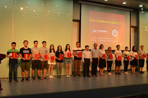 接着,常保国副校长与张保生教授上台对2015年司法文明指数优秀调研员进行了表彰并颁发了奖状。伴随着现场同学热烈的掌声,受到表彰的优秀调研员代表们上台发表了自己的获奖感言并分享了自己的调研经验,她们表示调研活动令自己受益匪浅,不仅锻炼了能力,还能在活动过程中了解当地的司法情况,对我国的法制建设有更加深刻的认识。