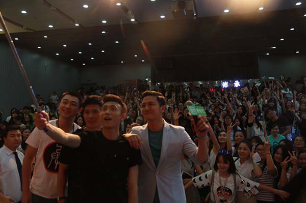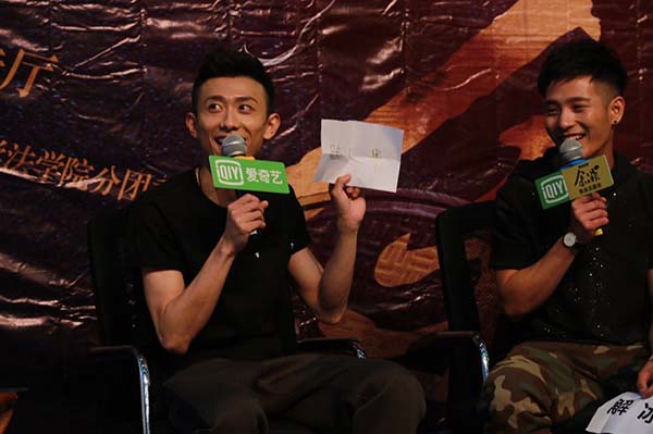 活动的高潮被“兄弟团现场演技展示”点燃,兄弟团选取现场幸运观众,与他们进行演技互动,现场表演《余罪》中经典片段。经过抽签,“汉奸”成功变身安佳璐,“鼠标”抽到了“路人乙”,而我们的“二哥”张一山则成了电视剧中不可或缺的重要角色——“路人甲”。尽管设备简陋,缺乏事先准备,兄弟团精彩的演出仍引起粉丝尖叫连连.