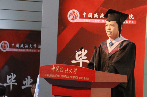 毕业典礼第二项,由学生代表发言。他首先向大家分享了自己的毕业感受,表达了自己对母校的不舍和留恋。他同时也表示自己将和同学们一起在以后的日子里以责任自律,以学问和法治自勉,为家庭和家族自强。最后,他代表全体毕业生对母校、对恩师、对父母、对几年来奋力拼搏的自己表示了衷心感谢。