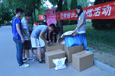 学生会承办的毕业捐赠活动在昌平校区组织开展。本次活动面向全校2014届毕业生,募捐地点位于法渊阁后的校道上,募捐所得物品将寄往贵州省遵义市习水县桃林乡沙溪完小学。