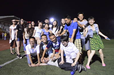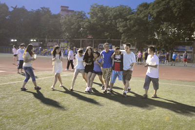 本次趣味运动会设置的比赛项目新颖而有趣,大家以班级为单位进行了“六人七足”、“企鹅漫步”、“猪八戒背媳妇”等项目的比赛,从开始到结束每个班级的参与热情都十分高涨,不仅赛场上竞争激烈,啦啦队的助威呐喊声更是震耳欲聋,大家玩得不亦乐乎。随后,因为天气原因临时改变了活动形式,毕业班的同学都聚在看台上,由其他年级的同学为大四的同学表演节目并送上毕业祝福,大家的表演形式丰富多彩,不仅有吉他弹唱,更有体委会的同学们倾情演绎的情景短剧,虽然大家来自全国各地、来自不同的年级和班级,但大家互相交流、畅谈未来,气氛温馨而欢乐。